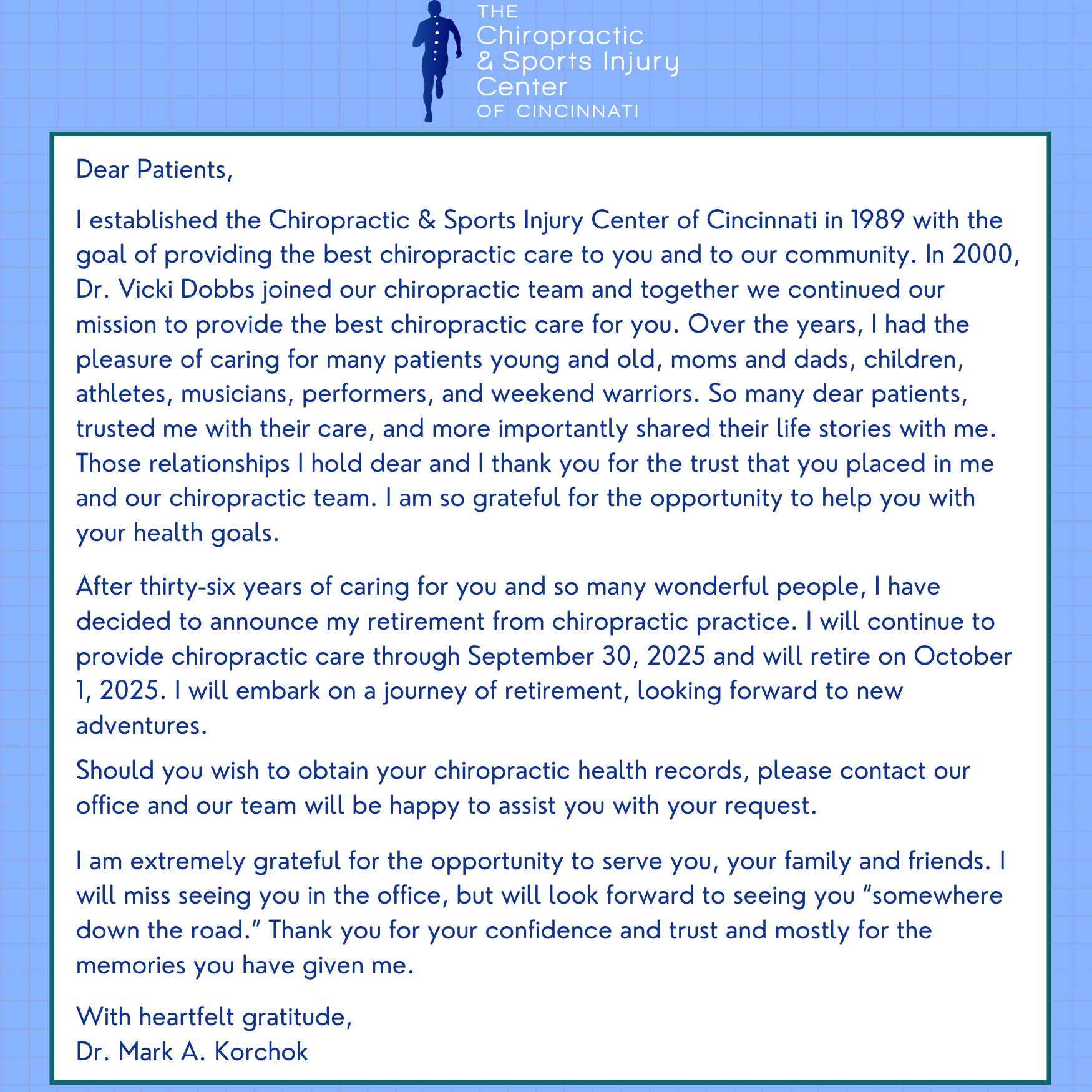 Since 1987, Dr. Mark Korchok and his dedicated team have been committed to helping individuals and families across the greater Cincinnati area live healthier, more active lives. With over three decades of experience, we take pride in providing exceptional care tailored to your unique needs, whether you’re recovering from an injury, managing chronic pain, or simply looking to maintain your wellness.